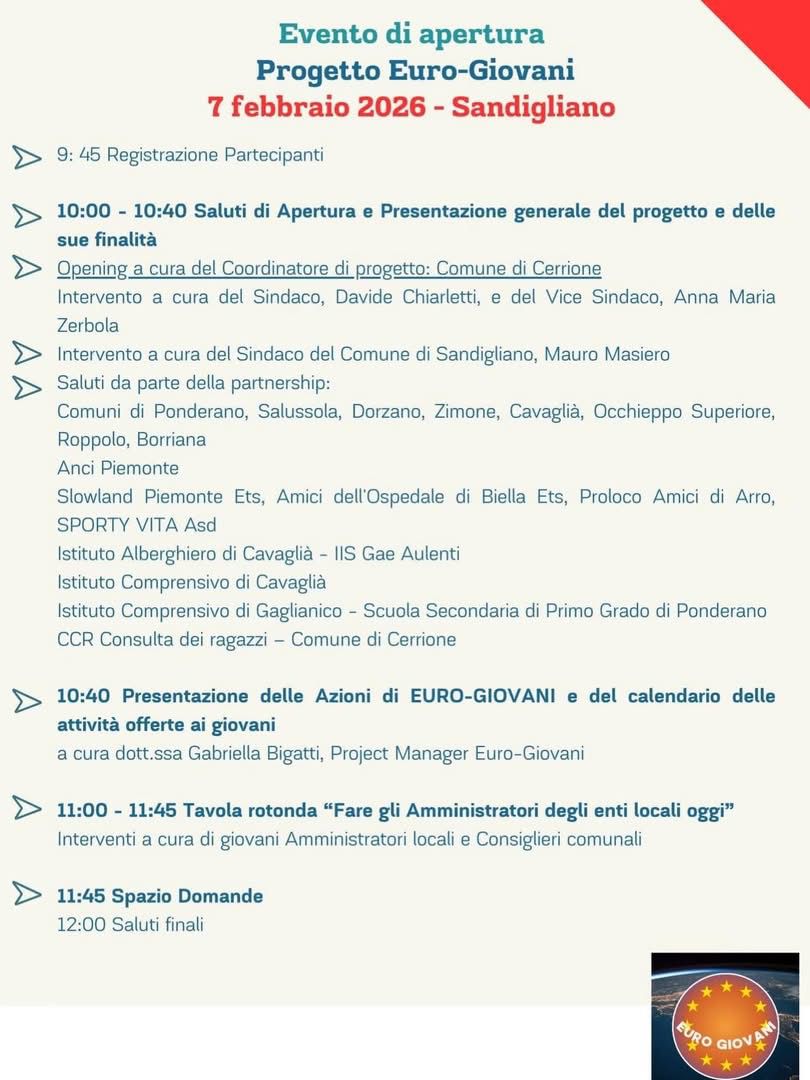📌Sarà Sabato 7 febbraio 2026, dalle 9.45 alle 12.00, presso il Centro Polivalente Comunale di Sandigliano (BI), l’evento di apertura ufficiale del Progetto “EURO-GIOVANI”, iniziativa sostenuta da Regione Piemonte e Dipartimento per le Politiche giovanili e il Servizio Civile Universale - Presidenza del Consiglio dei Ministri, rivolta ai giovani del territorio biellese.