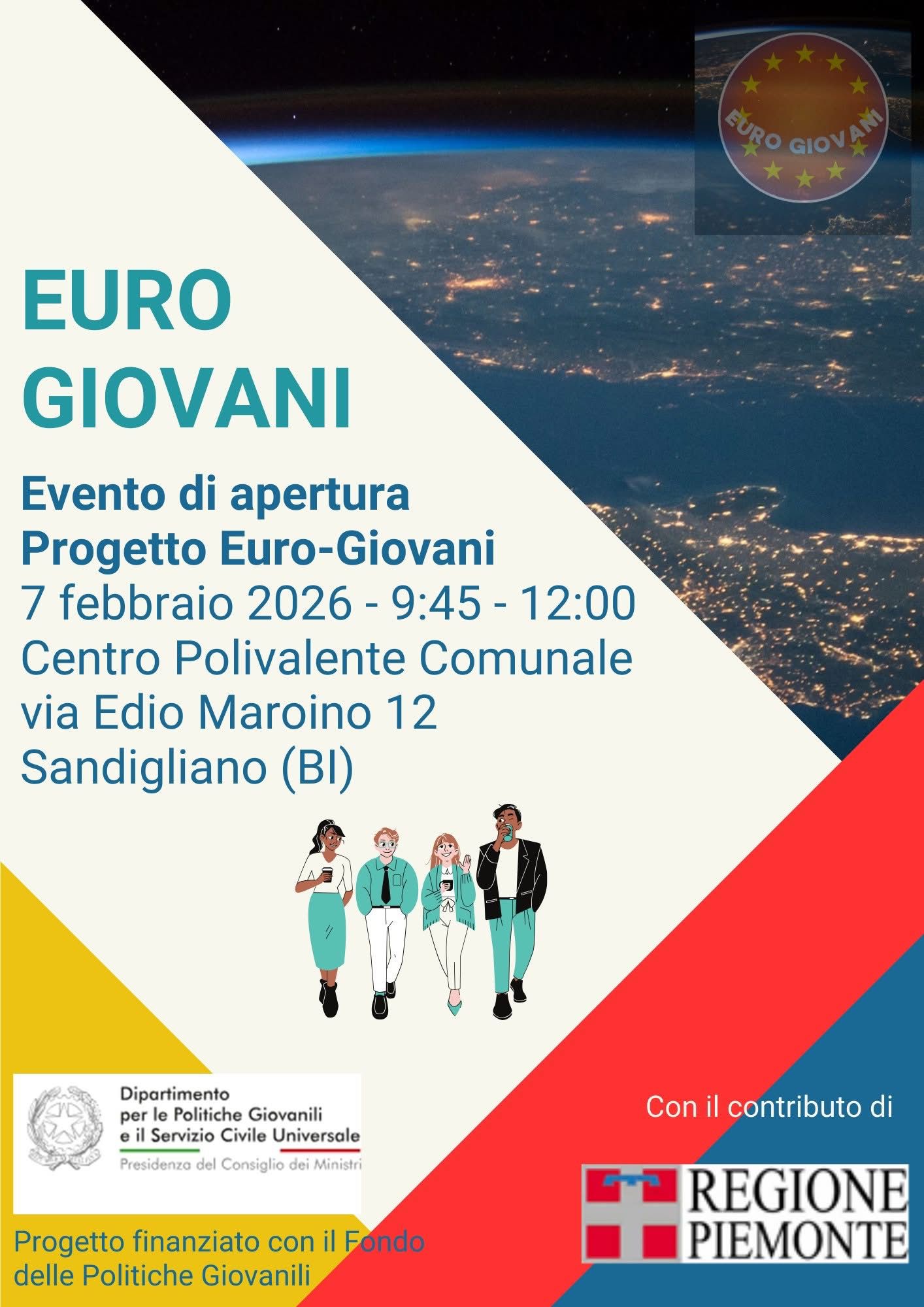 📌Sarà Sabato 7 febbraio 2026, dalle 9.45 alle 12.00, presso il Centro Polivalente Comunale di Sandigliano (BI), l’evento di apertura ufficiale del Progetto “EURO-GIOVANI”, iniziativa sostenuta da Regione Piemonte e Dipartimento per le Politiche giovanili e il Servizio Civile Universale - Presidenza del Consiglio dei Ministri, rivolta ai giovani del territorio biellese.