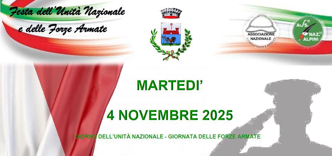 Sono lieta di invitare tutta la Cittadinanza partecipare alla Commemorazione della Festa dell’Unità Nazionale - Giornata della Forze Armate, che sì terrà Martedì 4 novembre 2025 nel nostro Comune con la partecipazione degli alunni della classe 5ª della Scuola Primaria di Borriana e con il seguente programma: